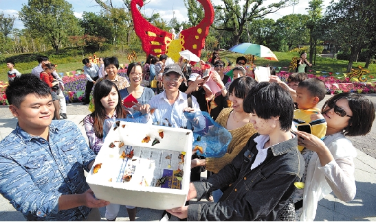 10月4日上午9时,宁波梁祝文化园,今年“梁祝相亲会”成功相亲的数对情侣在昆虫专家林海伦先生带领下,放飞百对蝴蝶。 龚国荣 汪建芳 摄