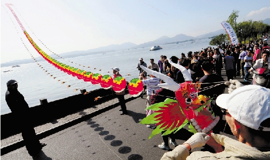 10月4日上午,杭城的许多风筝爱好者相聚西湖白堤,放飞各种风筝,给游客带来了惊喜。