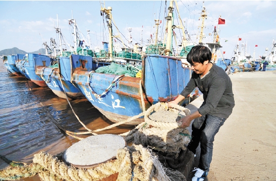 10月4日,在台州市椒江区东风码头,渔民给进港避风的渔船系好缆绳。