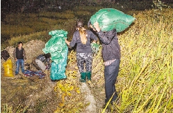 10月5日晚,景宁畲族自治县东坑镇竹埠村村民连夜抢收稻谷。 通讯员 李肃人 摄