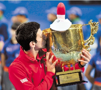德约科维奇在颁奖仪式上亲吻奖杯庆祝。