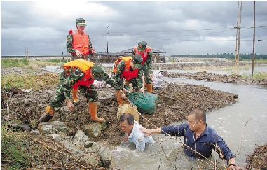10月6日下午,瑞安市飞云江口一养殖区内潮水倒灌,造成一个近两米宽的缺口。边防民警发现险情后,和养殖户一起填堵缺口。 蔡宽元 陈孝和 摄