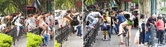 国庆长假,西湖景区岳王庙前的隔离栏,成了不文明游客跨栏之地。 里尔 摄