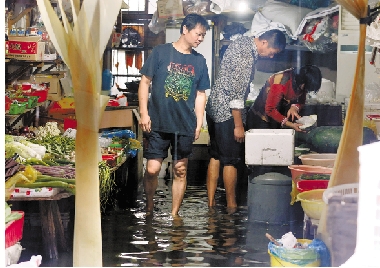“菲特”给杭州带来了强降雨,七堡社区由于地势低洼积水难以排出,积水严重,许多居民家中进水。 本报记者 林云龙 摄