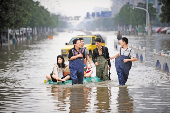 10月9日,台风“菲特”重创浙江后,余姚市70%以上城区被淹。据当地政府通报,全市83万人受灾,市民只能靠各种水上工具进出。 本报记者 梁臻 胡元勇 摄