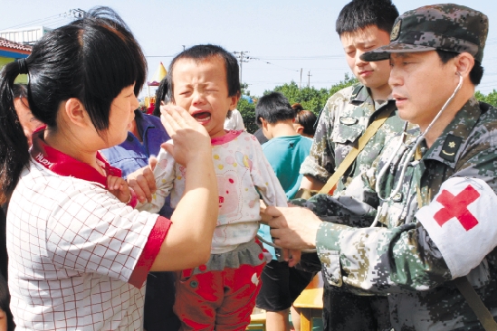 10月12日,省军区为民服务队深入临时安置点为群众义务巡诊。
