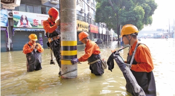 10月11日,余姚市区世南东路积水80厘米深,来自台州温岭供电公司的支援人员在检查线路,防止恢复供电时发生触电事故。