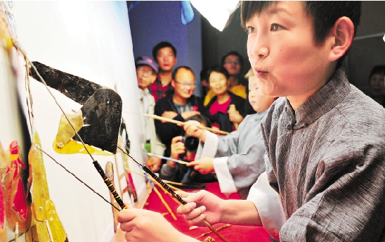 10月18日,在2013杭州文博会的场馆里,一支由20名袖珍演员组成的皮影戏队伍为观众表演。他们平均年龄22岁,平均身高1.26米,他们的出色表演深受观众喜爱。图为袖珍演员在表演皮影戏。 张关春 摄