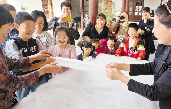 10月20日,中国丝绸博物馆组织杭州小朋友及家长,来到海宁云龙村蚕俗文化园,体验老底子的手工丝织技艺。图为小朋友正在体验拉丝。
