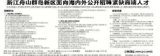 为充分发挥人才引领支撑作用,加快推进浙江舟山群岛新区建设,浙江省决定利用三年时间面向海内外为浙江舟山群岛新区引进200名紧缺高端人才,现将首批招聘有关事项公告如下: