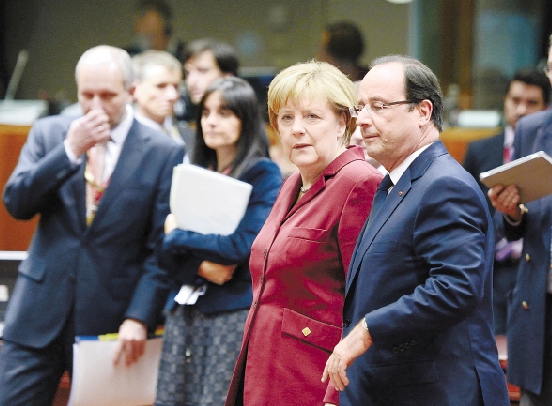 10月24日,在比利时布鲁塞尔欧盟总部,法国总统奥朗德(右一)与德国总理默克尔(右二)抵达欧盟峰会会议现场。