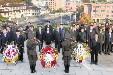 10月25日,在朝鲜首都平壤,中朝两国代表向朝中友谊塔敬献花圈。