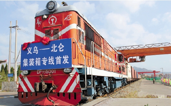 10月25日上午,满载着40个集装箱出口货物的货车缓缓驶离义乌西站。这是义乌—北仑海铁联运集装箱专线开行的首趟货车,标志着港口与内陆腹地物流产业的合作升级。 吕斌 马锦标 摄