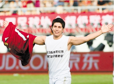 11月3日,在中超联赛收官之战中,广州恒大队球员孔卡进球后动情地脱去球衣,里面背心正面写着“无论我身在何方,你们都在我心里”,背面则是“感谢”两个大字。本赛季后孔卡将离开恒大队,这样的告别让所有恒大球迷动容。 新华社发