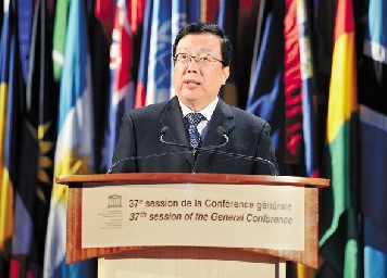 11月5日,郝平在巴黎召开的联合国教科文组织第37届大会上发表就职演说。 新华社记者 陈晓伟 摄