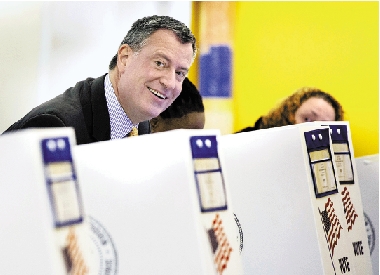 11月5日,在美国纽约,比尔·德布拉西奥参加选举投票。 新华社发