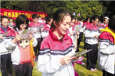 杭州高新实验学校近日举办主题为“青春·理想·成长”的首届青春节,同学们来到浙江大学光华法学院参观学习,借名校浓郁的校园文化,引领求学励志的梦想。图为同学们共唱少年先锋队队歌。 张玉峰 摄