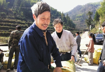 村民忙着抬稻谷。 徐贤飞 卢伟星 摄