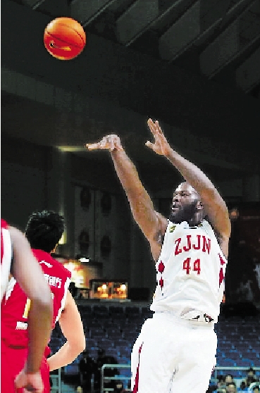 图为浙江稠州银行男篮与吉林队的比赛中,该队外援约翰逊投篮。
