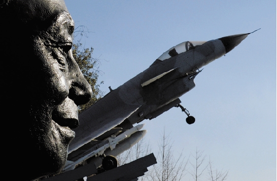 2013年11月28日,中国航空工业集团公司大楼外摆放的歼-10战机。 视野网供图