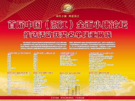 首届中国(浙江)全面小康论坛由求是《小康》杂志社联合浙江日报报业集团共同主办。论坛推选活动本着客观、公正、权威、公益的原则,根据党的“十八大”提出“全面建成小康社会”的新要求,参考全面小康统计监测指标体系和中国小康指数评价体系,自2013年9月启动以来,得到社会各界热烈响应和积极报名,活动经过社会推荐和单位自荐、调研组实地考察、候选单位公示、公众投票以及推选委员会初审、终审,最终在413家候选单位(个人)中推选出公众投票票数名列前茅、各项评价指标及口碑均上乘的8大类奖项的获奖名单。在12月1日召开的首届中国(浙江)全面小康论坛上,论坛组委会隆重揭晓首届中国(浙江)全面小康论坛推选活动获奖名单。具体获奖名单公布如下(排名不分主次):