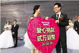 宁波市电力系统为10对新人举行集体婚礼,新人们为余姚灾区群众捐款2万元。(优秀奖) 张敬愉 摄