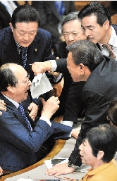 12月5日,在日本国会参议院国家安全保障特别委员会上,在野党议员冲向该委员会委员长中川雅治(左坐者),试图阻止法案通过。