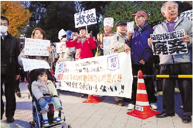 12月6日,在日本东京,抗议者在国会前手举标语,要求废除《特定秘密保护法案》。 新华社记者 刘天 摄