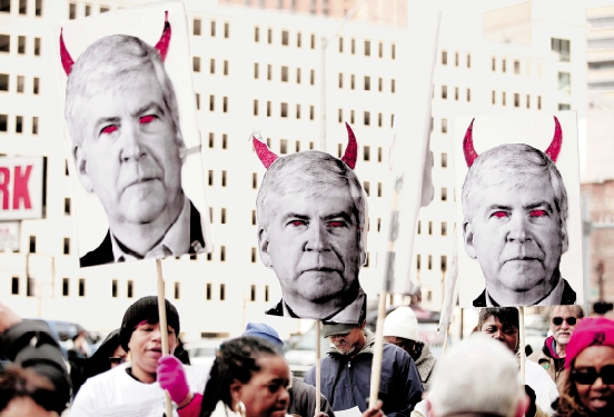 今年10月28日,底特律申请破产一案举行听证会,大批示威者恶搞密歇根州州长里克·斯奈德画像,在法庭外示威抗议。