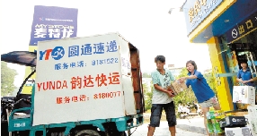 员工将遂昌特产装车发货。每天下午,麦特龙遂昌特产仓储式超市的员工将遂昌网店协会会员通过网店协会旗下分销商城平台所销售的特产通过快递、EMS、物流等方式发送到全国各地,减少了会员们平时需要取货、发货的时间。