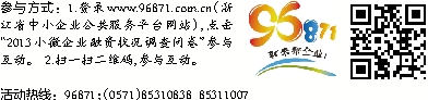 参与方式: 1.登录www.96871.com.cn(浙江省中小企业公共服务平台网站),点击“2013小微企业融资状况调查问卷”参与互动。 2.扫一扫二维码,参与互动。