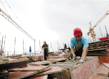 临海市公共租赁房建设项目一期工程,建筑工人在已接近结顶的8号楼楼顶加紧施工。