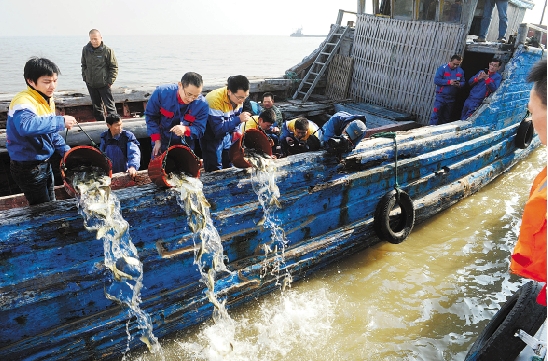 12月12日,宁波海洋世界在市海洋与渔业执法支队帮助下,组织员工在象山港外海放流1万多尾大黄鱼苗,丰富海洋渔业资源。 宁波晚报记者 龚国荣 摄