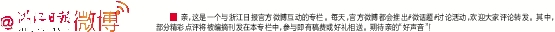 亲,这是一个与浙江日报官方微博互动的专栏。每天,官方微博都会推出#微话题#讨论活动,欢迎大家评论转发。其中,部分精彩点评将被编摘刊发在本专栏中,参与即有稿费或好礼相送。期待亲的“好声音”!
