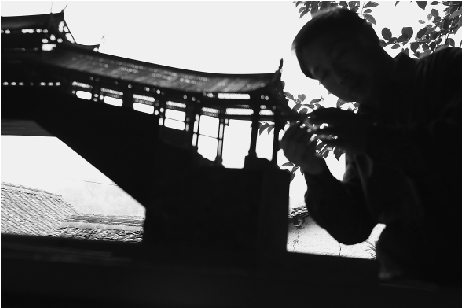 在廊桥模型上反复尝试各种结构方式,并对细节精雕细刻。
