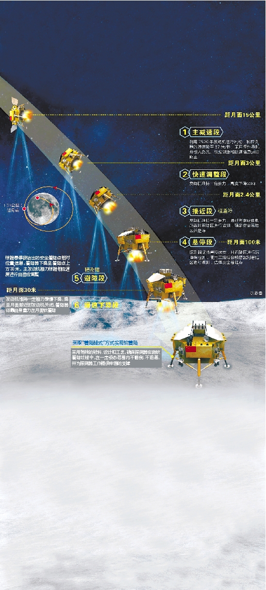 发动机维持一定推力缓慢下降,降至月面附近时发动机关闭,着陆器依靠自身重力在月面软着陆