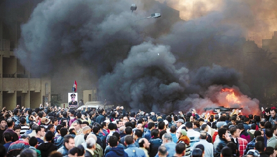 12月24日,在埃及曼苏拉市,反对穆兄会,支持埃及国防部长赛西的民众在汽车炸弹爆炸现场举行示威游行。 新华社记者 潘超越 摄