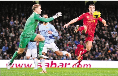 | 12月26日,在2013-2014赛季英超联赛第18轮比赛中,曼城队主场以2比1战胜利物浦队。图为曼城队守门员哈特(左)在比赛中与利物浦队球员亨德森拼抢。目前,堪称英超“最强阵”的曼城仅落后“领头羊”阿森纳1分。切尔西、利物浦紧随其后。在这前4名的球队中,彼此间最大分差仅有3分。 新华社发 |