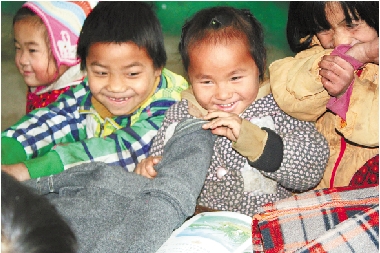 日前,杭州崇文实验学校家委会携手“格桑与兰”公益基金发起主题为“冬日暖阳”的捐赠活动,为四川泸州山区约1000名学生捐赠了4.8吨冬衣和文具。图为枧槽苗族乡的孩子高兴地捧起了捐赠物品。 通讯员 重文 摄