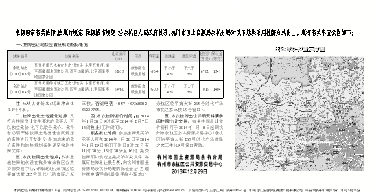 五、本次挂牌出让详细资料请参阅挂牌出让文件。有关挂牌出让文件资料可于2014年1月10日起到杭州市余杭区公共资源交易中心(余杭区临平南大街265号时代广场市民之家三楼)L9号窗口索取。