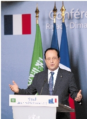 12月29日,沙特阿拉伯国王阿卜杜拉会见到访的法国总统奥朗德,双方就叙利亚、伊朗和黎巴嫩等中东热点问题进行了磋商。当日,奥朗德在沙特出席新闻发布会。 新华社发