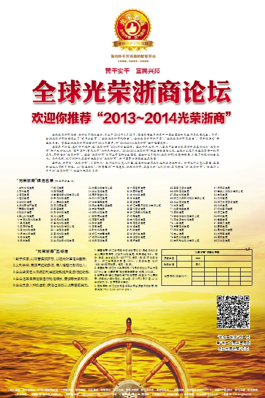 3.推荐说明:每位读者限填一张推荐表,提名20个光荣浙商,多填或少填均无效。截止日:2014年3月21日,以当地邮戳为准。推荐表复制有效。