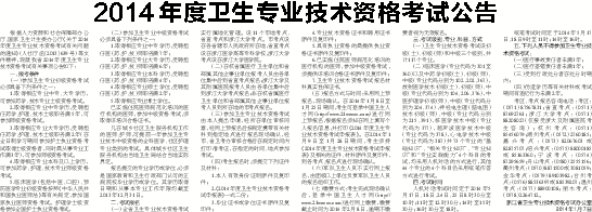 根据人力资源和社会保障部办公厅、国家卫生计生委办公厅《关于2014年度卫生专业技术资格考试有关问题的通知》(人社厅函〔2013〕639号)等文件精神,现就我省2014年度卫生专业技术资格考试有关事项公告如下: