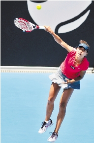 1月10日,在澳大利亚霍巴特举行的国际网球赛女双半决赛中,中国选手张帅与搭档、美国选手雷蒙德以2比1战胜西班牙组合阿鲁阿瓦雷纳/埃斯皮诺萨,闯入决赛。图为张帅在比赛中发球。 新华社发