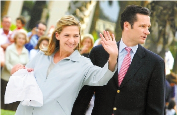 图为西班牙国王胡安·卡洛斯一世之女克里斯蒂娜公主怀抱新出生的女儿伊雷妮与丈夫乌丹加林在公众面前亮相(资料照片)。 新华社发
