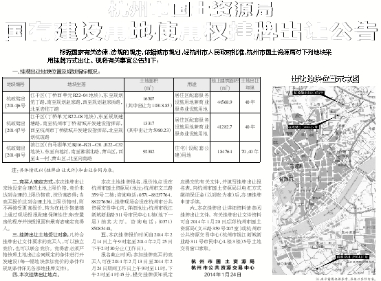 六、本次挂牌出让详细资料请参阅挂牌出让文件。有关挂牌出让文件资料可自2014年1月28日后到杭州市国土资源局(文三路359号207室)或杭州市公共资源交易中心(杭州市钱江新城新业路311号市民中心L楼3楼)5号土地交易窗口索取。