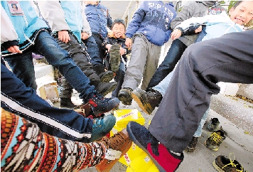 王坛镇中学的孩子们正在试穿新鞋子。 王志水 摄