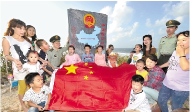 1月28日,三沙公安边防支队永兴边防派出所干警在石岛西沙主权碑前,给孩子们讲解国旗知识。春节期间,三沙公安边防支队开展 “走进三沙、走进军营”活动,让来西沙永兴岛过春节的“兵二代”们零距离感受军营生活,接受爱国主义教育。 新华社记者 赵颖全 摄