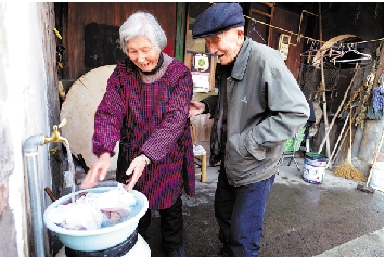 1月28日,舟山定海区金塘镇大鹏岛胡家大院住户用上了刚开通的自来水。 姚峰 摄