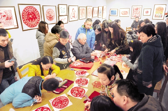 嘉兴美术馆剪纸现场热热闹闹。 李剑铭 摄